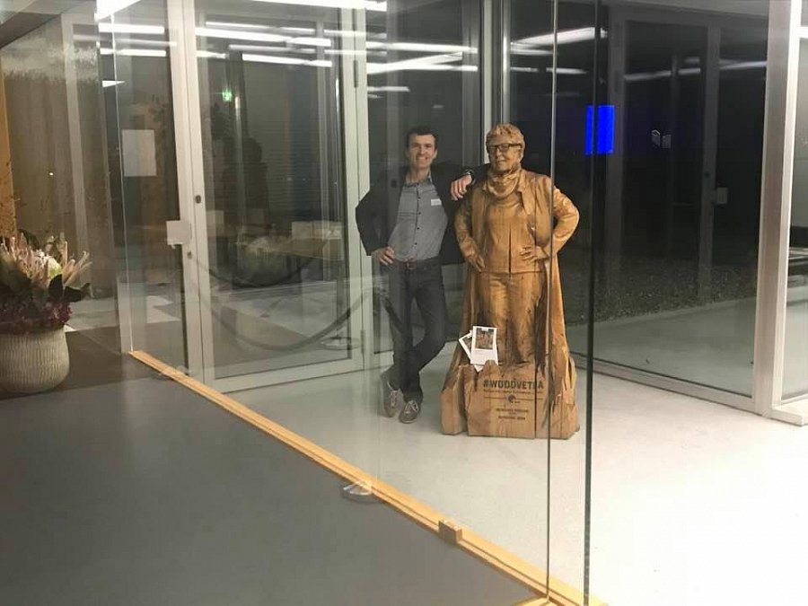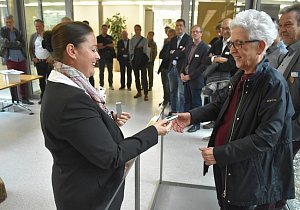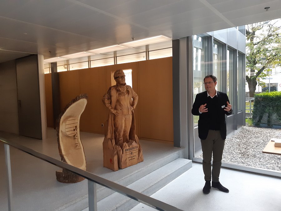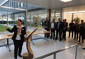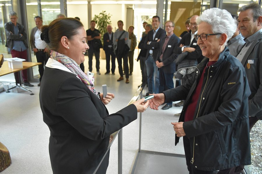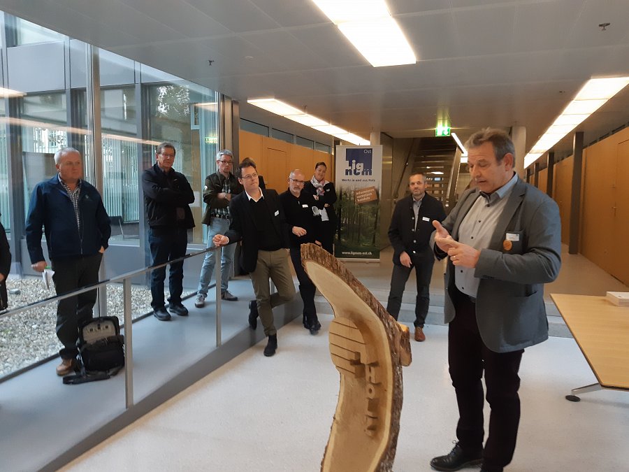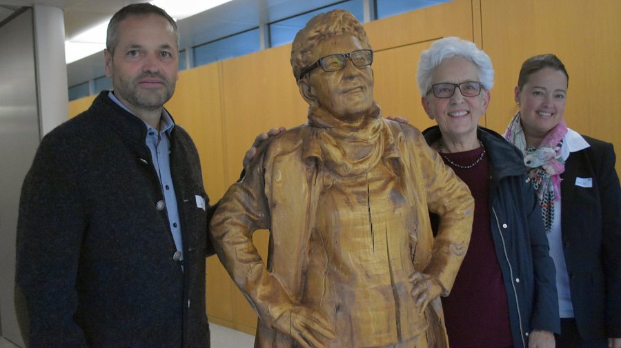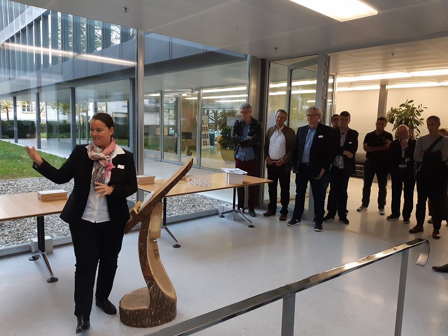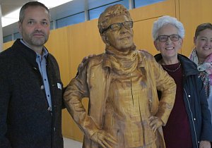 Das Bundesamt für Umwelt und die Wald- und Holzbranche haben vor zwei Jahren die Kampagne Woodvetia lanciert, um die Diskussionen um das Schweizer Holz in Gang zu bringen. Der Künstler Inigo Gheyselinck hat dafür aus verschiedenen Schweizer Holzarten 20 lebensgrosse Holzskulpturen von Persönlichkeiten wie Johanna Spyri, Gottlieb Duttweiler oder auch Simon Ammann geschaffen. Die 69- jährige Hildegard Kissling aus Aadorf, ehemalige Telefonistin der PTT, wurde bei einen Publikumswettbewerb als „Frau aus dem Volk“ ausgewählt. Aus einer 90 Jahre alten Berner Bergulme wurde dann ihr Ebenbild geschnitzt. Die Skulptur tingelte knapp zwei Jahre durch die Schweiz, stand auf dem Waisenhausplatz in Bern, bei der Triennale in Bad Ragaz und sogar im Bundeshaus. Nun kehrte die hölzerne Hildegard Kissling in ihren Heimatkanton zurück. Kantonsrat Paul Koch konnte als Präsident von Lignum Ost im Glaspalast der kantonalen Verwaltung in Frauenfeld rund 30 Holzfachleute zu einer kleinen Feierstunde begrüssen. Dabei zeigten der Thurgauer Kantonsbaumeister Erol Doguoglu und sein Schaffhauser Amtskollege Mario Läubli verschiedene Beispiele auf, wo eigenes Holz bei kommunalen Bauten in den Einsatz kommt – ja sogar dem Holz den Vorrang zu geben ist. Doguoglu bemerkte, dass sich Holz besonders bei Bauten mit grossen Spannweiten eignet und auch Käferholz durchaus die statischen Anforderungen erfüllt. „Wir müssen nicht mehr um den Baustoff Holz kämpfen, nur noch das Schweizer Holz platzieren“, bemerkte Toni Horat, der als OK-Präsident auch als Mister Woodvetia bezeichnet wird. Die Regierungsrätin Carmen Haag dankte als Chefin von Wald und Bau den Beteiligten für das Engagement für das schweizer Holz und überreichte Hildegard Kissling ein Sackmesser.